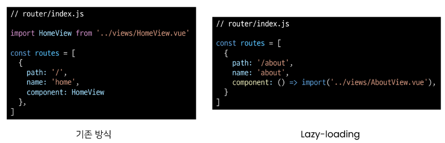 โ ๋ฏธ๋ฆฌ ๋ก๋ํ์ง ์๊ณ ํน์ ๋ผ์ฐํธ์ ๋ฐฉ๋ฌธํ ๋ ๋งคํ๋ ์ปดํฌ๋ํธ์ ์ฝ๋๋ฅผ ๋ก๋ํ๋ ๋ฐฉ์์ ํ์ฉํ ์ ์์