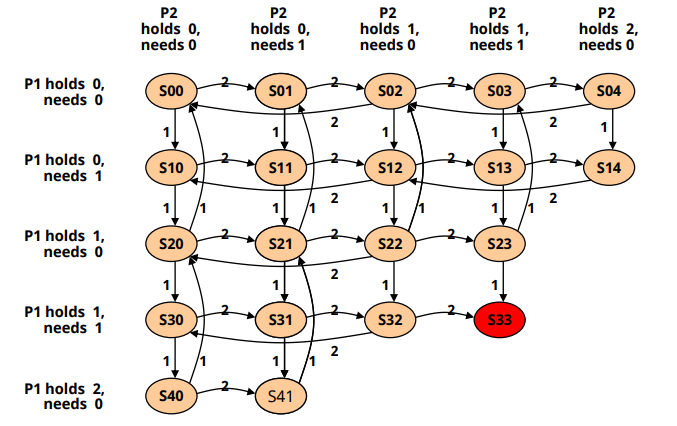 β P1μ P2κ° κ°μ§κ³ μλ R1μ, P2λ P1μ΄ κ°μ§κ³ μλ R2λ₯Ό μμ²νκ³ μλ€ -> μλ‘ λ°μ κ°λ₯μ±μ΄ μλ μ΄λ²€νΈλ₯Ό κΈ°λ€λ¦¬κ³ μμΌλ―λ‘ deadlock!