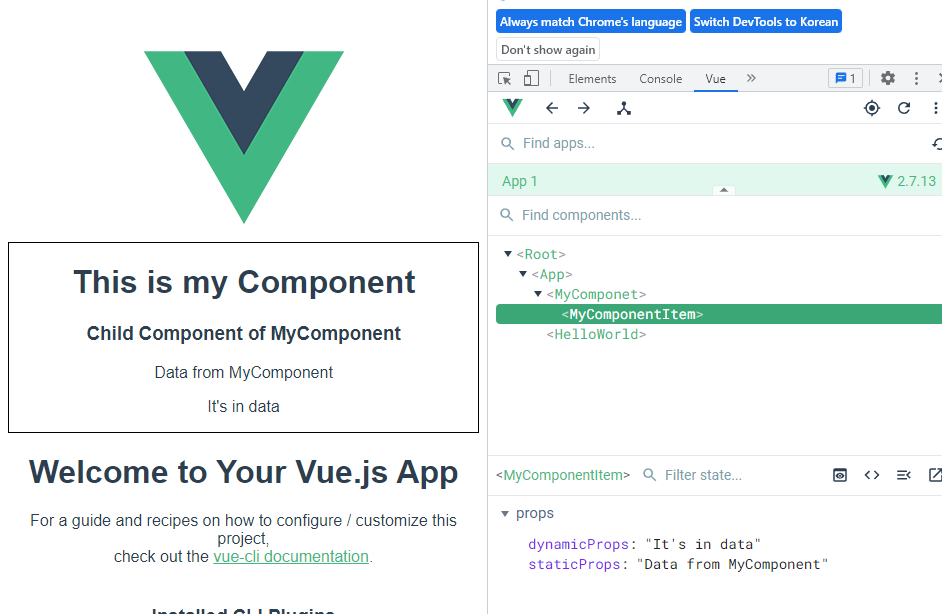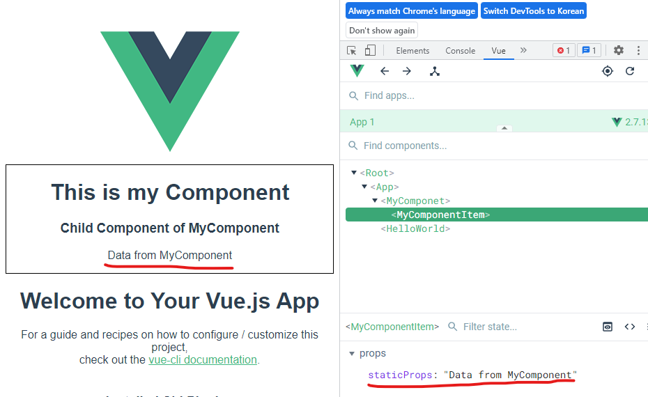 โ :dynamic-props="dynamicProps"๋ ์์ key๊ฐ (dynamic-props)์ด๋ ์ด๋ฆ์ผ๋ก ๋ค์ " "์์ ์ค๋ ๋ฐ์ดํฐ(dynamicProps)๋ฅผ ์ ๋ฌํ๊ฒ ๋ค๋ ๋ป